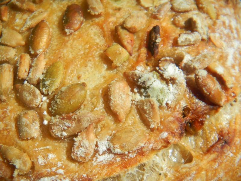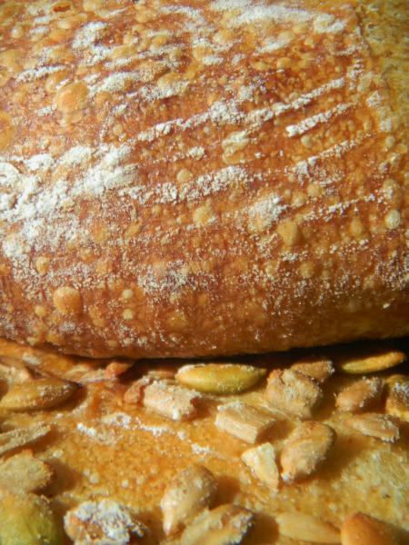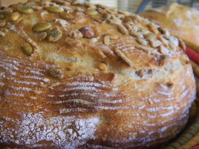 I had thrown some of the seeds into the bottom of the oval basket before the dough went in so when the seeded bread was un- molded I slashed 2 crescent moon shapes on the top where the seeds stopped, about 1/3 the way down from the top.  I cut a triangle on the top of the none seeded boule