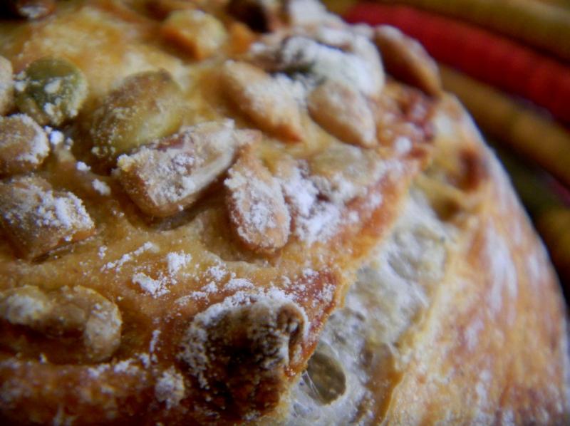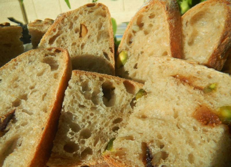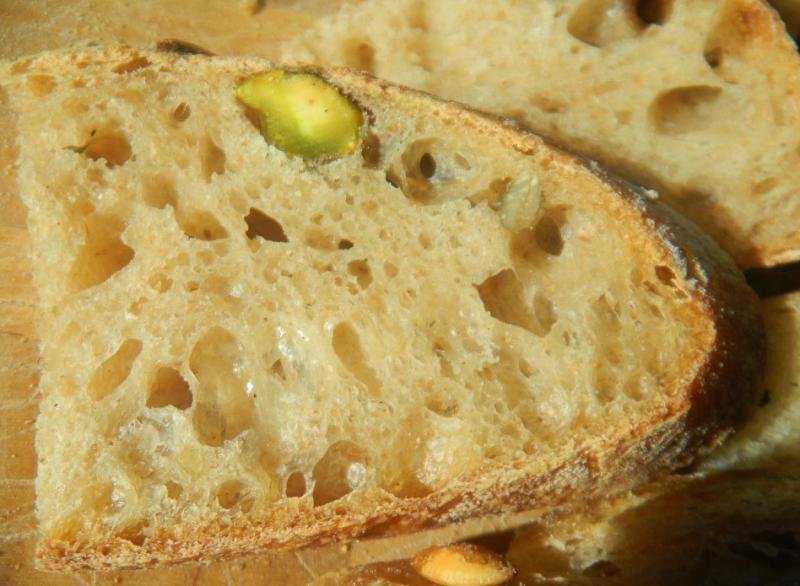 ...w/ or w/o 'stacios - but they must provide nice little flavor bursts in there.  Airy crumbs, hypnotic wavy dust-lines from your basketton, textbook crust gelation blisters.  Nice bake!  Creative process -- a keeper for sure.  Apprentice must have got a workout during that 15 min of FS&F.  Ain't no no-knead, that's fsure!  Gotta be sour after 20h BF.  But with such a low inoculum to begin with, maybe not so.