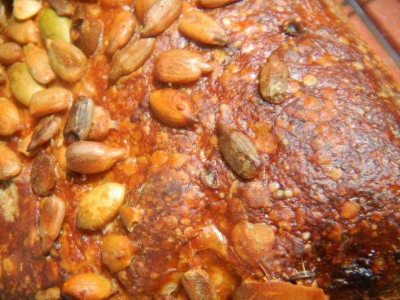It baked for another 10 minutes after being turned 180 degrees after 5 minutes and removed from the pan. When it registered 205 F we turned the oven off and let the loaf crisp for 10 minutes before being removed from the oven to the cooling rack. This bread tastes as amazingly sour as the fig and pistachio bread did but it has a deeper flavor thanks to the bulgar scald and the extra whole grains. The crust was so crunchy and stayed that way even after it cooled - very nice. The crumb is not as open as the previous bake but it is just as soft and moist. We also like the extra seeds with the fruit and nuts too. Much better bread all the way around.