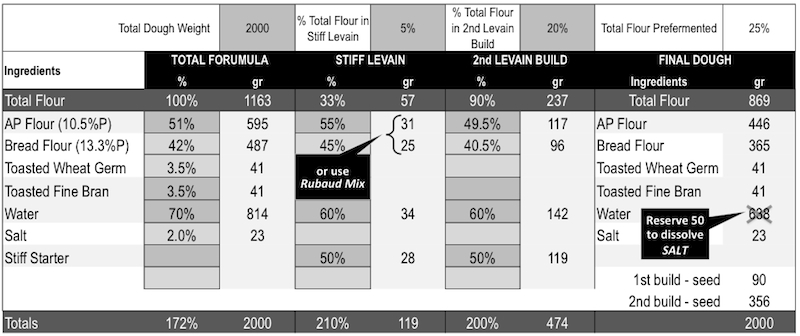 Levain building. My stiff levain thrives on its Gerard Rubaud feed so well that I tend to use it in the first build (which means the bread has fractional %-ages of spelt, rye + whole wheat -- although I confess I've taken to 50# sieving my Rubaud Mix -- somebody stop me!). In addition, I cold-retard the freshly mixed levain at each stage, straight to the fridge after kneading, for 12 to as much as 60 hrs before retrieving it to mature for 4-8 hrs @ 70-75˚F. My levain loves it when I do that for weekly refreshment, so I've indulged its preference for a chilly prelude at each stage. This stretches the process over more of the week, letting me feel like I'm doing some baking between weekends, even though it's just levain building. Toasting wheat germ and bran at least gives me a chance to turn on the oven M-F :-). I have not observed this early cold retard to sour the levain or final product the way retardation of levains or doughs that have partially or fully matured does.
