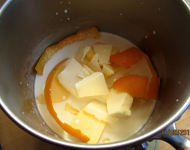 1. Put milk, butter, and orange peel in small saucepan over medium heat; stir until butter melts, 2-3 minutes. Remove from heat and let cool until warm. Discard orange peel, add orange blossom water, and whisk in eggs.