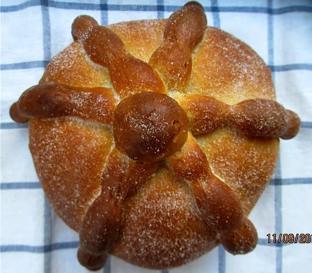 This Bread of the Dead is traditionally baked during the last weeks of October, before the Dia de los Muertos (November 1 and 2), and eaten at the cemetery, at the grave of a family member. The bone decoration is a reminder of the deceased, and the little roll on top represents a tear of grief.