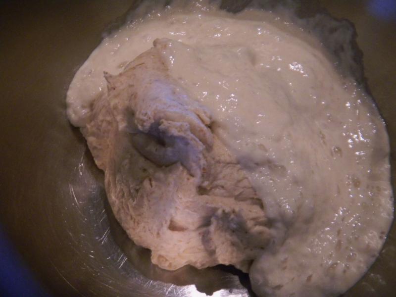 While the poolish warmed up for two hours the next day we autolysed the flours, salt toasted bits and water to make sure the flour was hydrated.