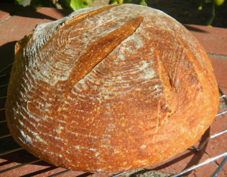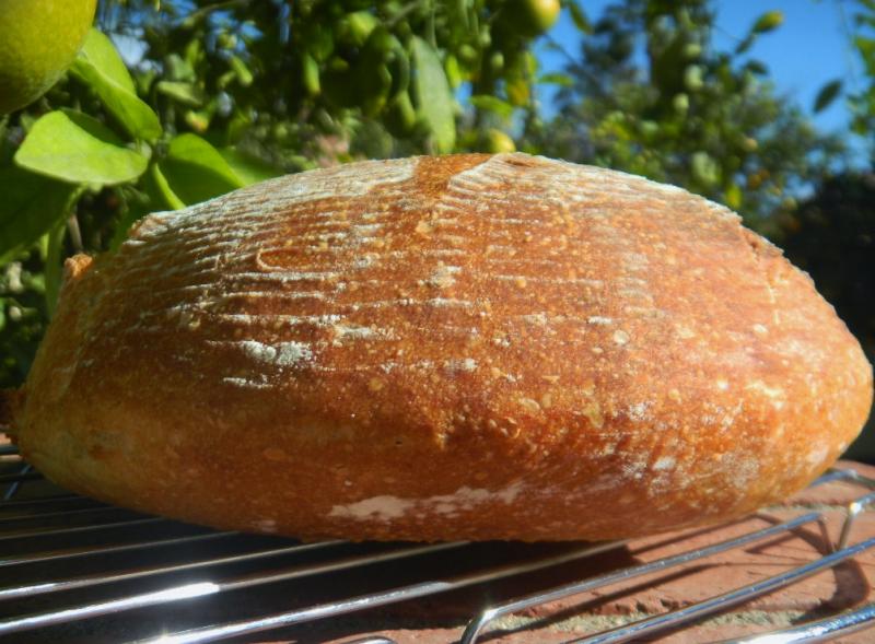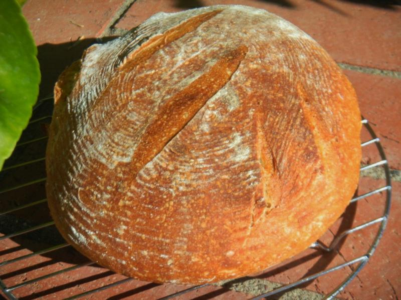 It sure baked up nicely on the outside, sprang well, has the mini's blisters and nice brown color.  We had one slash that blew out for some reason too.  Sure smells good, but we will have to wait for it to cool before we can look inside,