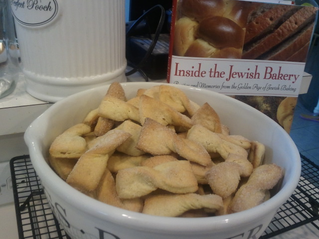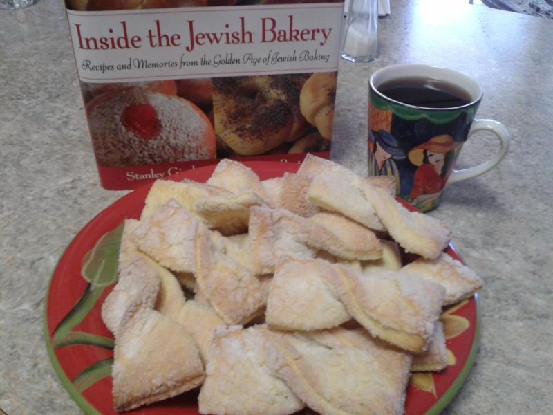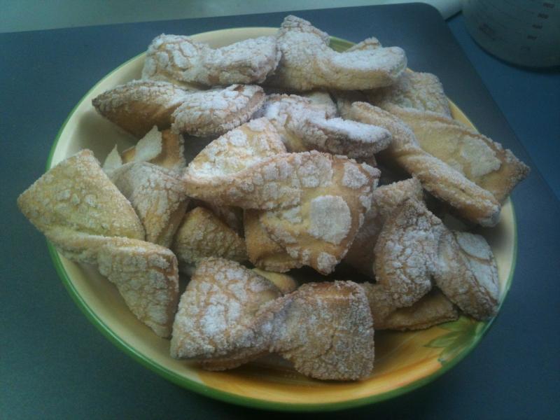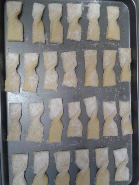 We 3 sisters baked Bowties this morning... what a fast and delicious dough this is... takes a group of eggs, so if you are needing to use some up this is your bake. These cookies are light and tasty and amazingly addictive. I can guarantee you that we are going to make these again, and again.