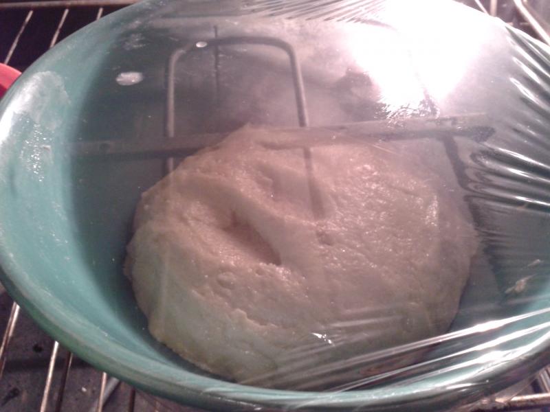 All of our dough looked about like this before the first rise... not all had the great reflection in the plastic wrap of my oven element!...