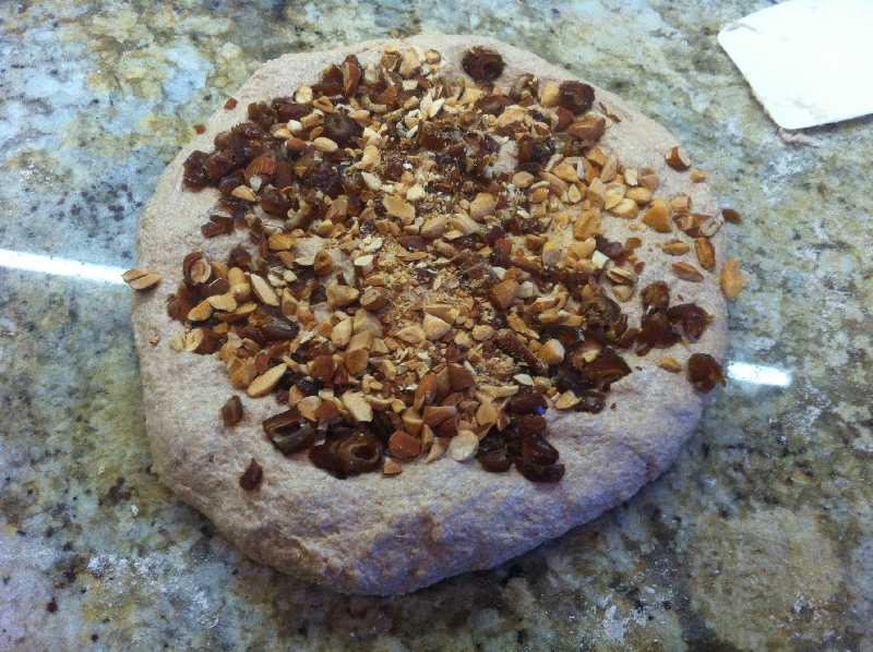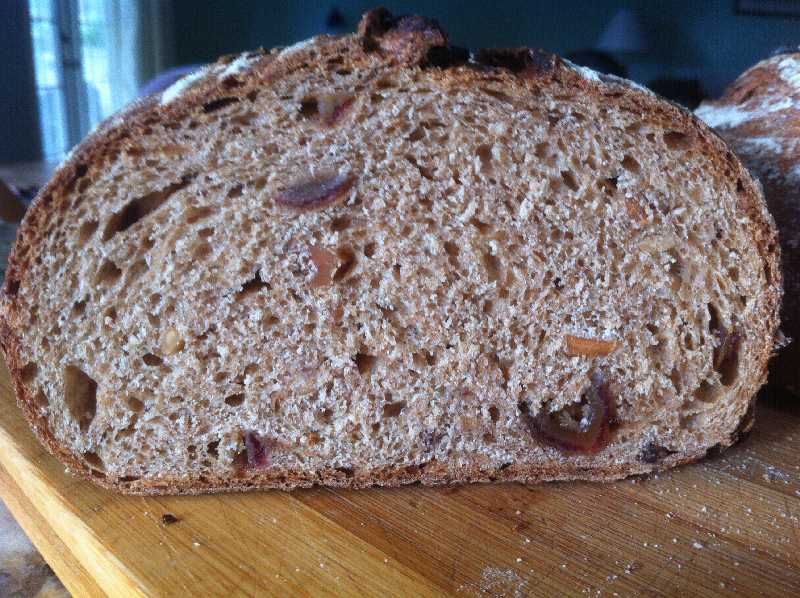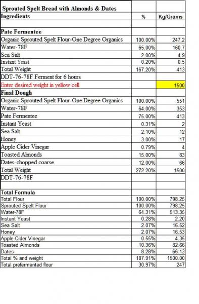 Hardly "my" new flour (as Varda calls it) but great that it caught your eye and even better that it inspired such a delectable product! I am so impressed with your (and Michael Wilson's - at 100% hydration!) ability to create such a perfect looking loaf with 100% of a flour (in)famous for its gluten challenge. I've been thinking for a long time that I don't really know what spelt tastes like, having used it at <10% (G Rubaud's proportion) when I do use it, plus sampling "ancient grain" breads at WFM in which there are so many other ingredients I can't sort out the spelt flavor. Baking this formula is certainly the answer. So THANK YOU for developing and posting it. Next time I'm near a WFM*, I'll see if they have this ODOF spelt and will plan to try your formula. Hopefully over the holidays. Almonds & dates - appropriately indulgent & festive. And thanks for contributing that cider vinegar tip. Makes sense, is vaguely familiar, and a great tool to add to the kit when gluten formation needs a boost.