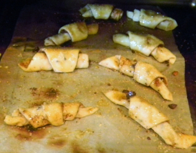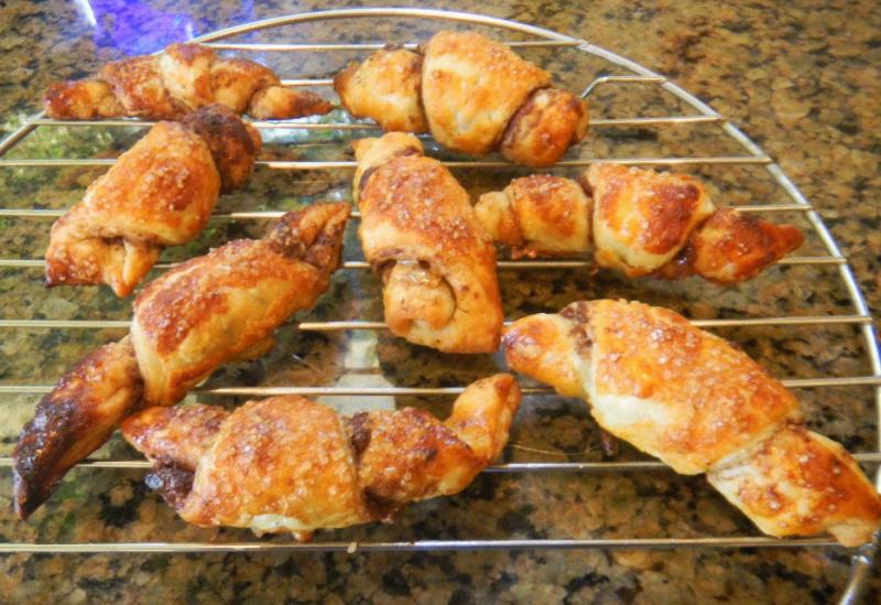 Rugelach are supposed be rolled out as a circle before cutting them into triangle shapes with a pizza cutter. We had square shapes of puff paste left over from our square snowflake experiment yesterday. No worries! Just roll them out thinner, say a little less than 1/8", brush them with melted butter, sprinkle in he filling, cut them into 8 pie shaped pieces and roll them up, croissant like. from the large end to the point.