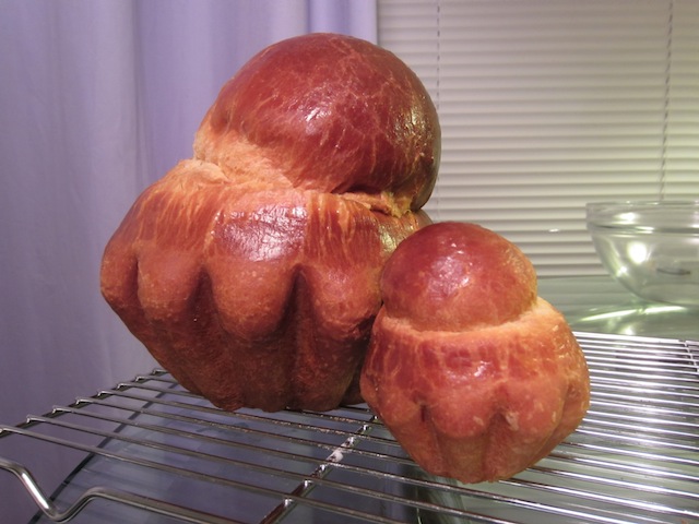 Not much substance in this post. I got a new 8 inch brioche mold in the mail and decided to make a gigantic brioche a tete, along with two small ones. The photo below is kind of cute because it looks like the big brioche is cuddling against the little brioche. Please excuse the obvious technical flaws. The tete was too large - it's 200 grams of dough vs. 400 grams for the body. Next time I'll scale it down to 150 for the tete and 450 for the body. Anyway, I hope you enjoy this entirely inconsequential photo!