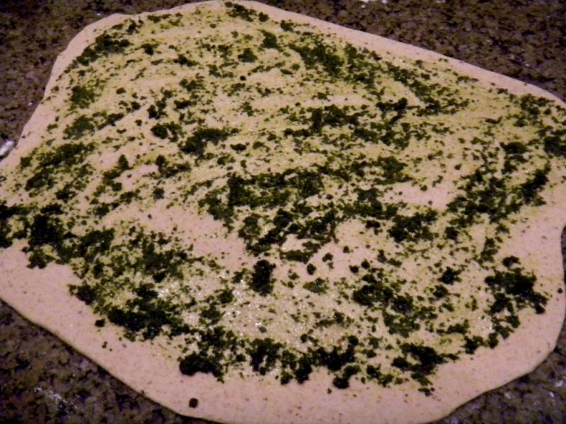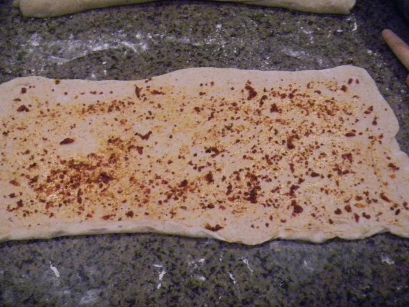After the French slap and folds were complete, we let the dough rest for 30 minutes and then 2 sets of S&F’s were done 30 minutes apart.  The dough was rested for 20 minutes, divided in half, rolled out with a pin and the filling spread on before rolling up into a log.