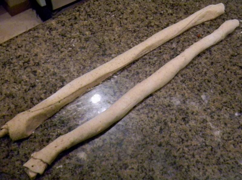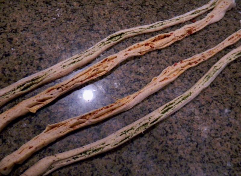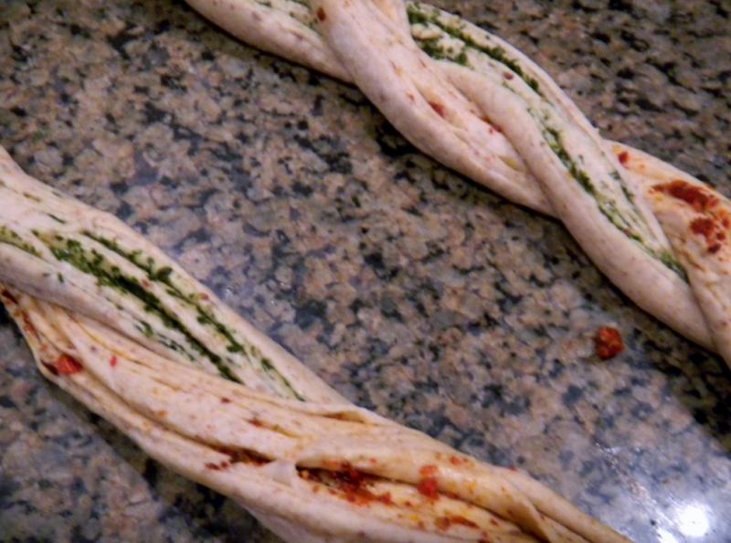 We had a little less than 900 g of dough compared to Breadsongs’s 1,200 g that she split in half and she only used half.  We split this in half too,  to make 2 ropes – one basil, almond, walnut, Parmesan and olive oil and the other sun dried tomato, oregano, salt, pepper and olive oil.  We decided not to use any garlic and hoped we wouldn't miss it with all the other stuff in this bread’s fillings.