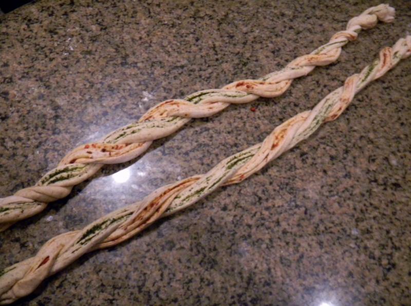 Each rope was split in half and combined with the other colored half and then braided to make (2) each red and green braids that were wrapped around each other to make a rose.  The ropes were smaller so we ended up with a more shallow Frisbee like, Italian Flat Bread Rose, but it was still very fancy do and Christmas festive looking.