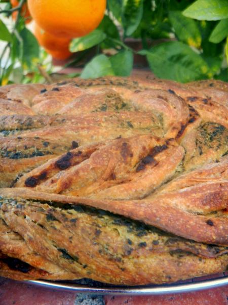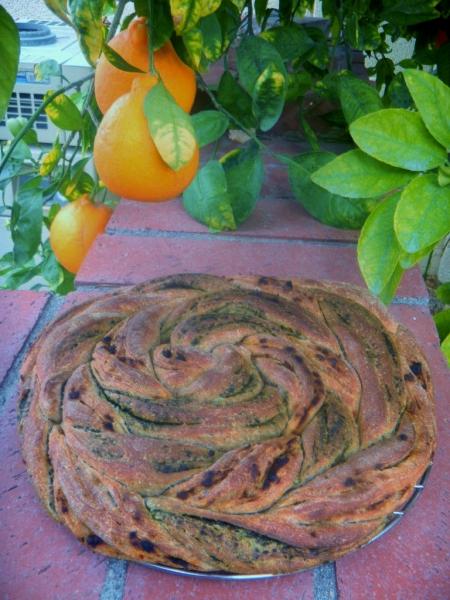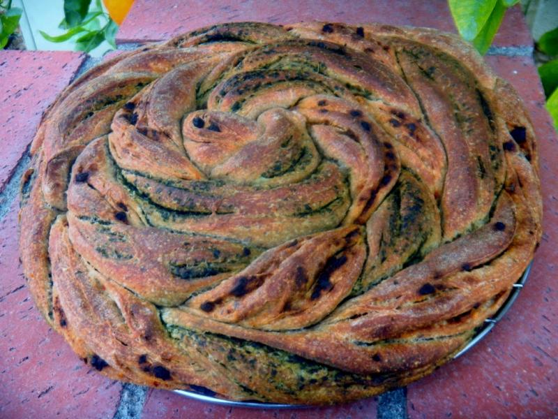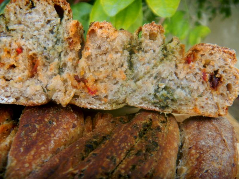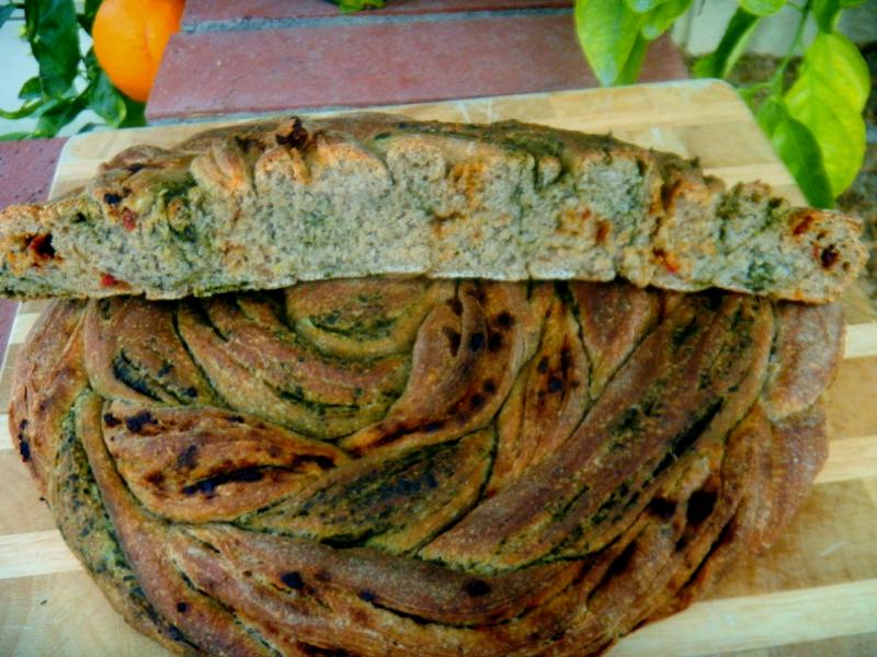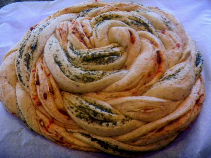 Our take on Breadsong’s fabulous Christmas Rose was to make it Green with basil pesto and Red with home made sun dried tomatoes.  We used our combo yeast water, rye sour and Desem sourdough starters with our 30% whole gain multi-grain mix of Kamut, dark rye, spelt and whole wheat.