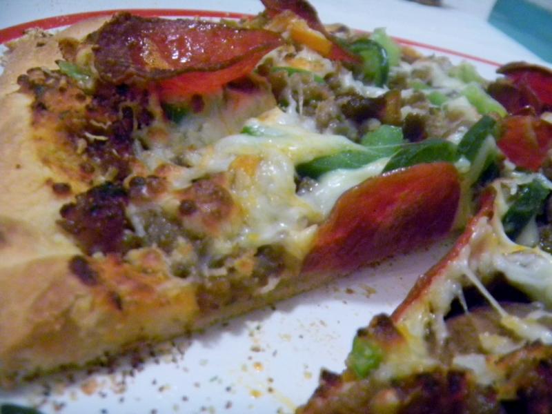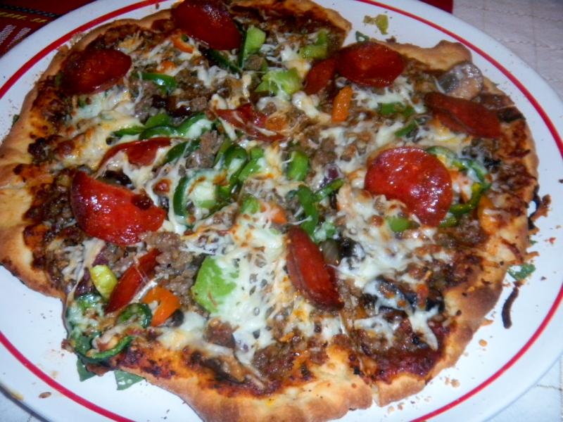 The pizza turned out very well and the toppings included all the usual suspects; Mojo de Ajo, hot and mild sausage (not home made this time), caramelized onions, caramelized; button, shiitake and crimini mushrooms, green and red bell peppers, poblano and jalapeno peppers, kalamata olives, pepperoni and 7 cheeses.