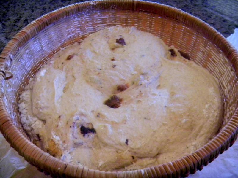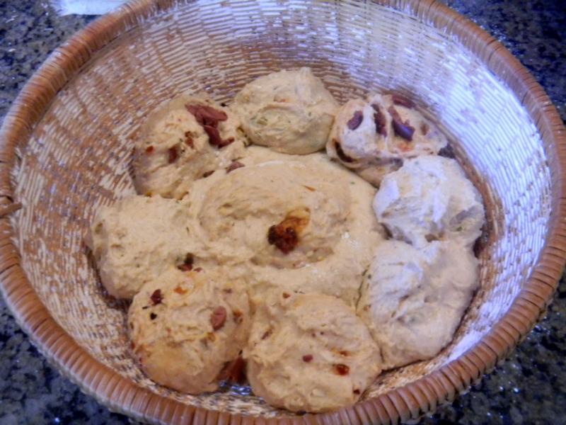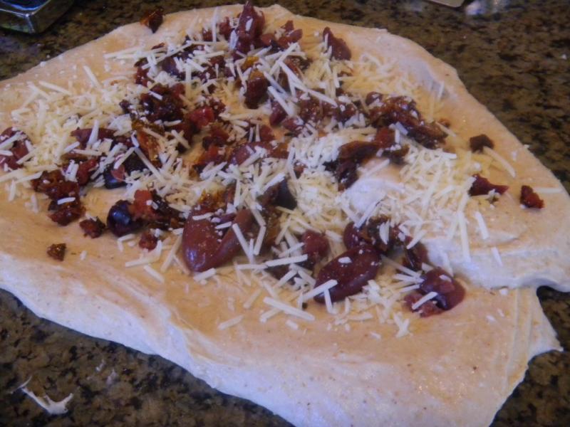 One half of the dough had kalamata olives, home made sun dried tomatoes and grated asiago cheese added to it and the other half had fresh rosemary, garlic and grated parmesan cheese. Now that sounded pretty Italian to me but I cut the salt down some to account for the salt in the add ins.