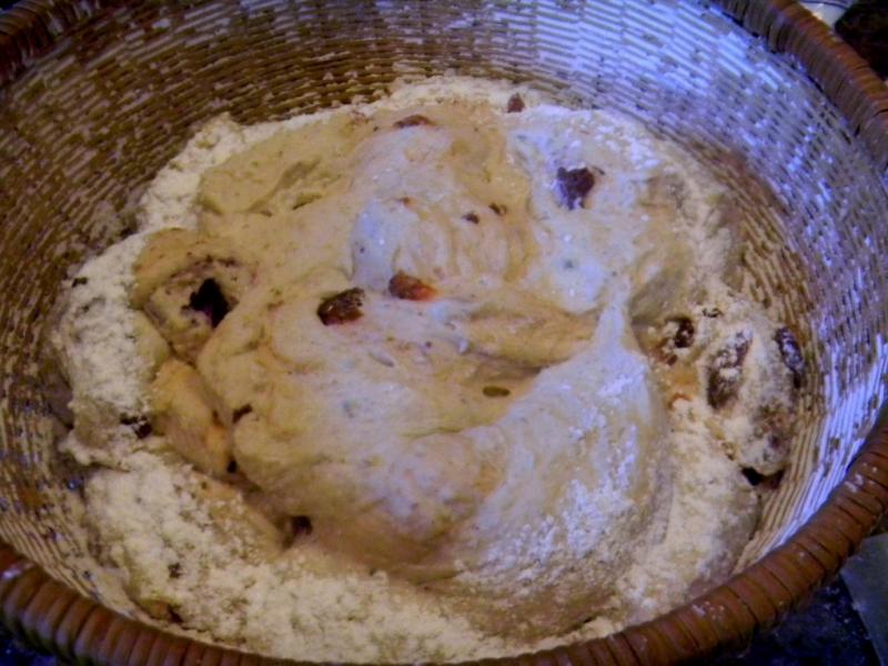 The ends were braided but instead of being tucked under they were rotated to the side to make the challah larger in diameter. This was placed on top of the rest of the shapes in the basket. It didn’t quite cover but we didn’t want to smoosh it up too much to see what the shape would be like on the bottom of the loaf after baking. Why should top get all the pretty decoration?