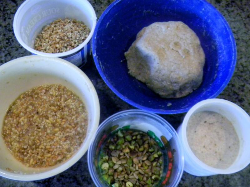 going while so far, far away? I thought this one might peak your interest in bread making once you get home again. The list looks long, and it is, but the grains are the same for sprouts, scald or flour so its not too bad - just lots of different prep steps. As you know, if you bake a couple of different kinds of bread every week the next thing you have is a little something of everything left over that needs using up. Plus, I believe in truth in advertising so, if you say multi-grain, seeds, nuts... etc. it better be multi-grain with plenty of all the rest :-)