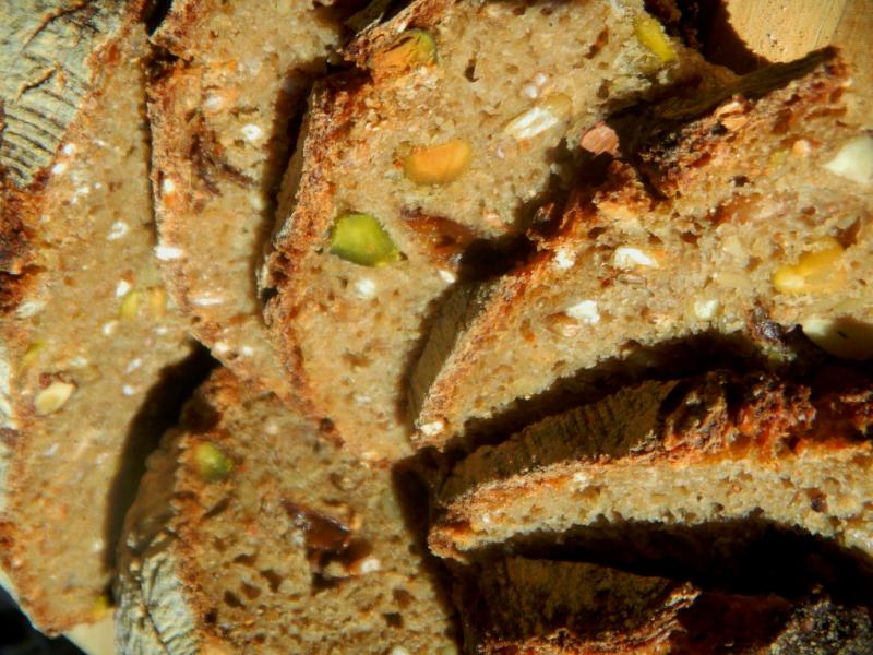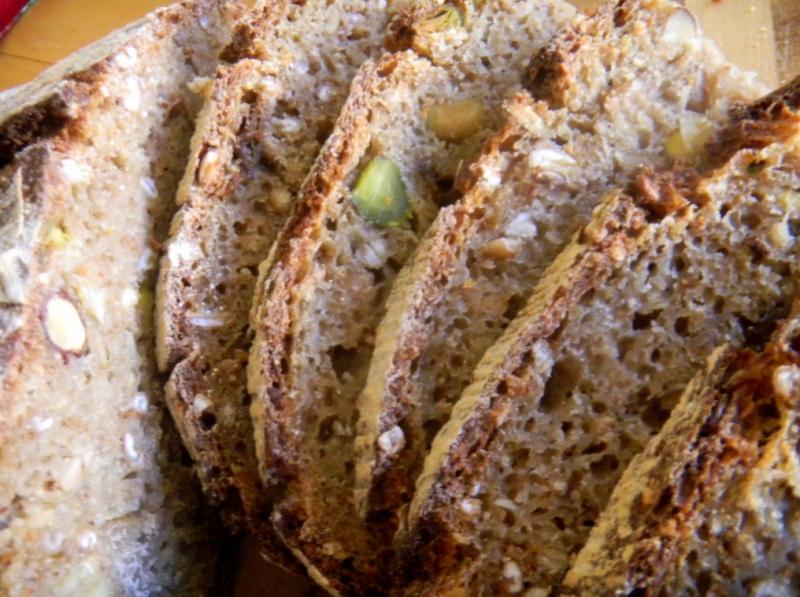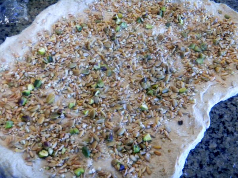 wanting to strike for not being mentioned and they get overlooked for bread purposes more than pistachios do around here :-) Pistachios have the color but the filberts have the flavor. Canaries have no worries, I use seeds and nuts already hulled except for eh pistachios and filberts ! This is very nice tasting bread with all the bells and whistles.