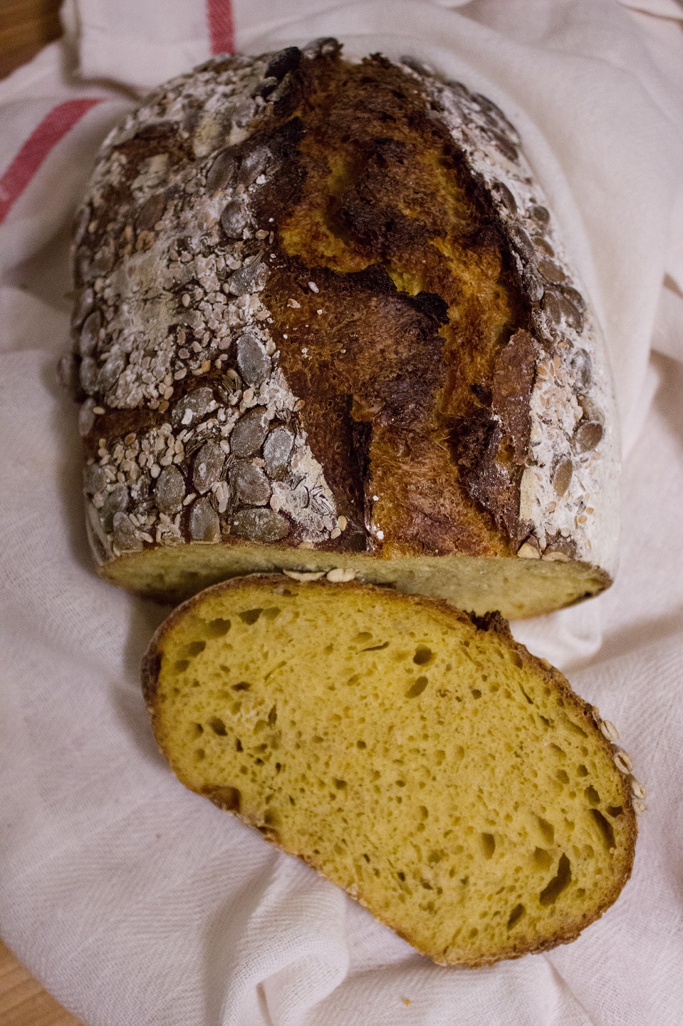 I had plans to make butternut squash clafoutis for Thanksgiving, but I ran out of energy and decided to use my drained, roasted butternut squash in this recipe. I didn't follow the recipe exactly - I threw in some rye and oat flakes to the main dough, shaped into a loaf instead of rolls, and added seeds to the top. I also forgot about it a couple times and screwed up the timing, so had to throw it in the refrigerator for both rises (which were extended to 8-12 hours). I'm really happy with the results, though. I love the orange color and flavor. I'll be making this again. It was a nice dough to work with.