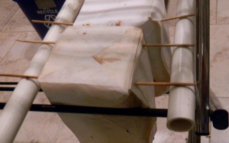 a tasty bread even though it is low cal and and all.  I here you actually lose weight by eating it since because you burn more calories chewing than you gain by swallowing.  That's my story and I'm sticking with it :-)  I got this panettone thing down now and have a way to keep it from falling out of the parchment paper next time too.   When it comes out of the oven I'm going to put additional skewers in above the top of the panettone to hold it in as it hangs.  Too bad my apprentice  think about it earlier.  At least we saves one this time and huge 100% improvement over last time.