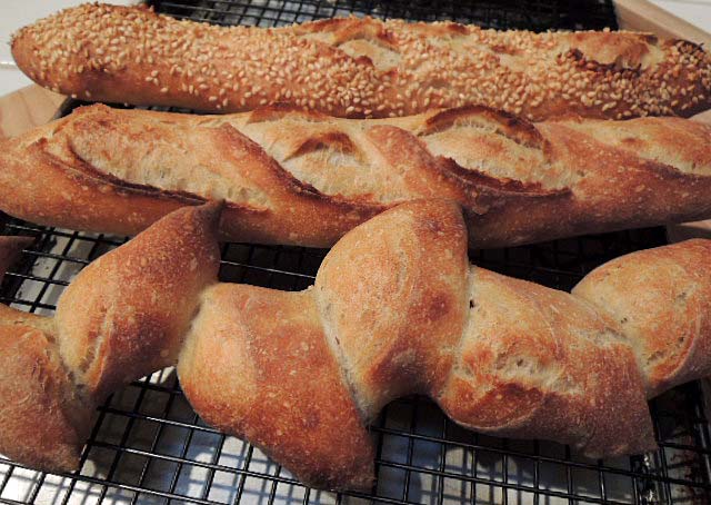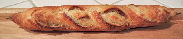 Bake at 460º F with steam for 12 minutes then in a dry oven for another 8-10 minutes. Note: These are light and thin loaves. For larger baguettes, the baking time would need to be increased to a total of 22-25 minutes. If a lighter-colored crust is desired, the oven temperature should be decreased to 450º F.