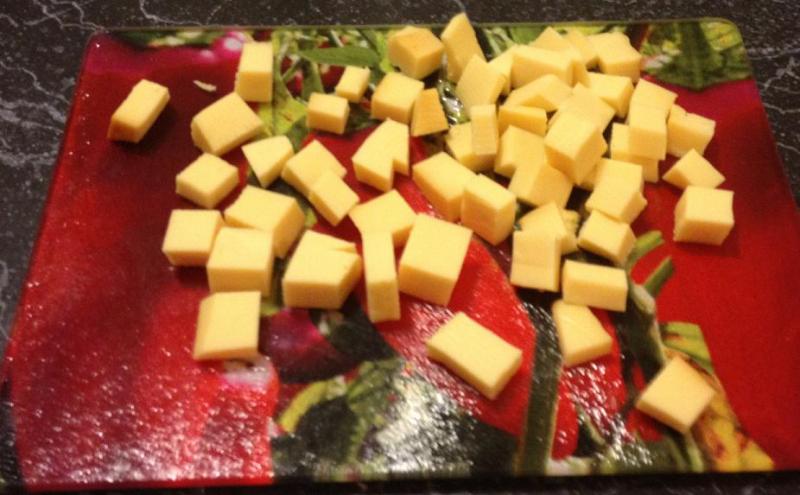 Mix all ingredients, except for the cheese. Knead by hand for minute or so, and fold into the dough. I cut these a little uneven in size so they would give different size pockets in the rolls.