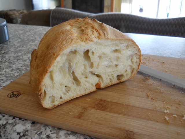 The dough was quite a bit different from what I had been making using a poolish, and I did put it in the frig for about 3 hours after I mixed the dough up.  I then let it warm up and raise at room temperature, doing S&F's along the way.  One of the first things I noticed was that everyone is right, it takes ALOT longer to rise than a dough with commercial yeast.  It finally doubled up and I shaped it and let it raise in a banneton for about 1 -1/2 hours, then slashed and popped into my oven.  The loaf was really ugly coming out of the oven as I still have shaping issues and it seemed that one of my slashes caught up with my seam and blew the side of the loaf out.  Ugly or not, it is tasty!  The bread has a mild but better flavor than my poolish breads.  I thought that the poolish breads have been good, but this has been the best tasting bread, hands down!  I do not quite understand how it can be flavorful and mild at the same time, but there you have it - yummy!  The crumb is very open, a little chewy and the crust has a nice chew to it also.  I did not steam, I am tired of getting burned, so I wet the loaf down with my hands before popping it onto the stone.  Its ugly, but its good.  I feel like one of those old V-8 juice commercials and that I should smack my head and wonder why I did not try a starter sooner!