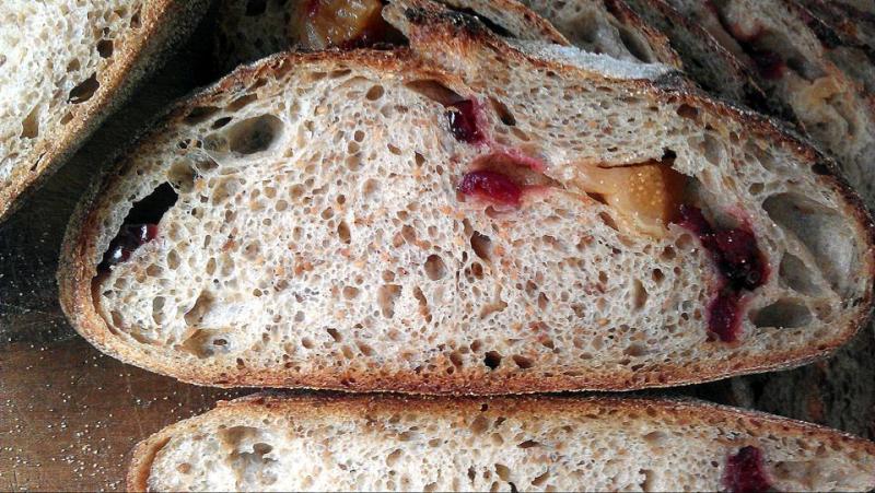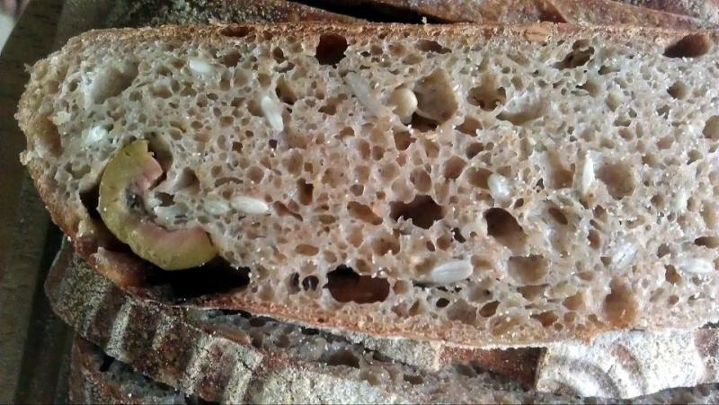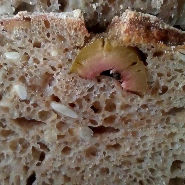 this is a wholewheat with polenta, sunflower seeds and green olives sourdough bread
