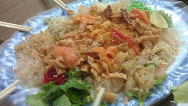 Prosperity Toss, also known as lo hei (Cantonese for 撈起 or 捞起). It usually consists of strips of raw fish, mixed with shredded vegetables and a variety of sauces and condiments, among other ingredients. Yusheng literally means "raw fish" but since "fish (鱼)" is commonly conflated with its homophone "abundance (余)", Yúshēng (鱼生) is interpreted as a homophone for Yúshēng (余升) meaning an increase in abundance. Therefore, yusheng is considered a symbol of abundance, prosperity and vigor.