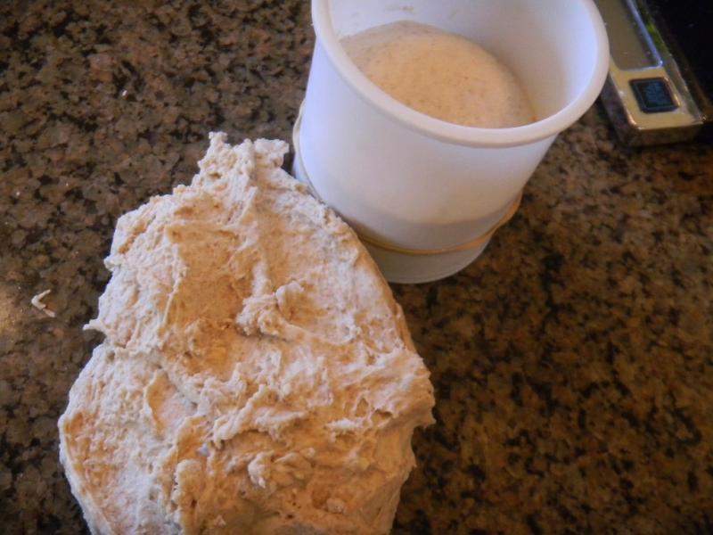 Then before the levain went in we cut off half the autolyse for the old dough. After that each dough was treated the same, together at the same times, yet separate . The same - yet separate would make a good book title for a story about twins separated at birth. Back to baking.