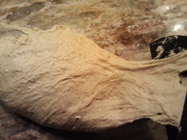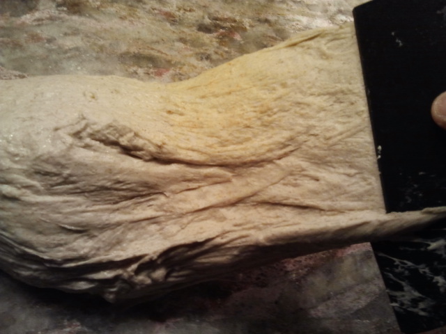 About 9:30PM I mixed in the starter by hand, added the salt , and a pinch of  instant yeast – This was a lot of starter ( 50% of the total flour) which made a very wet dough requiring a fair amount of stretch and folds to get in mixed well and under control – In another hour, I did  a couple more stretch and folds.  According to my calculations the final dough adjusting for the Starter Hydration and high amount of starter was ~ 82% hydration.