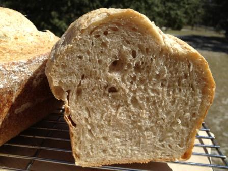 then I did my own: used my rye starter, did 2 feedings with BF, added to the final dough some rye flour and did a 48 hour bulk fermentation in the fridge. I let the dough wake up 1 1/2 hour before shaping and did a final fermentation of about 2 hours. Oven was preheated to 450F, I baked @375F 20 min with steam and 25 min @350F. As you see I baked in the bread pan and with low heat in order to accommodate my husband's and friend's view of " real "bread :) .