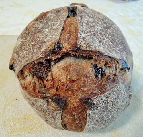 On March 3, 2013, I blogged about the San Francisco-style bread with Walnuts and Figs I had baked. More recently, SallyBR tried that formula, substituting dates for the figs and found it to be very good. Today, I baked another version this time substituting dried sour cherries for the figs. The formula was otherwise the same. The procedures were different only in my treatment of the levain which was adapted to my scheduling needs.