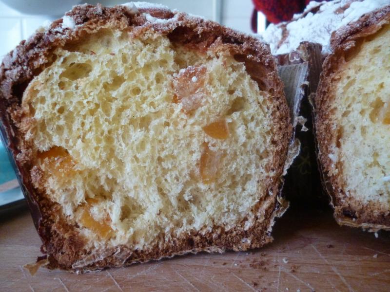 When it came out of the oven I suspended it upsidedown for about 12 hours. I was reasonably happy with the oven spring. Most recipes I've seen for colomba use less candied fruit, so I was expecting this not to grow quite so much. Not because the fruit would interfer with the yeast, but simply because there was less dough in the case (only 795g of impasto, rather than the 850g to 870g I've seen in other recipes).