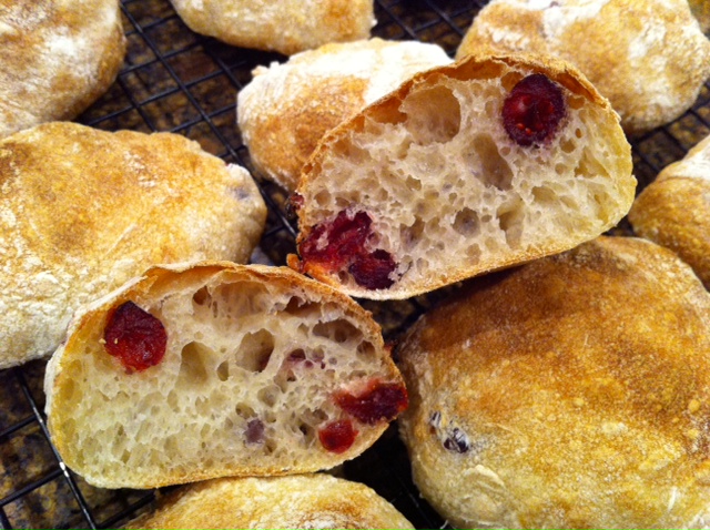 First time making ciabatta, second time using a pre-ferment. Craisins added.The results made me smile... Log in or register to post comments Wouldn't mind subbing them for the McMuffin for breakfast, with sausage, jam, cheese and egg!Nice baking! Log in or register to post comments They look great! especially being your first.Well done. Log in or register to post comments Thanks! I'm a beginner baker, having a lot of fun and learning a great deal, especially from here :) Log in or register to post comments