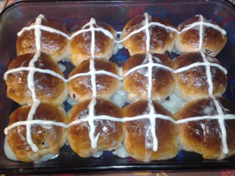 We 3 gmas baked Hot Cross Buns... for Good Friday, but baked early due to one of us traveling out of town on our regular baking day... Nothing spectacular to report on this bake, except the amazing taste of this recipe we got from the Home page on this site!!! Here are the pictures... we are actually pretty close to the same this time... Barb left off the glaze because of hubby's diabetes... other than that, you would think we baked in the same kitchen. I am loving these sisterly bakes across the country, and thanking God for the gift of Easter morning.