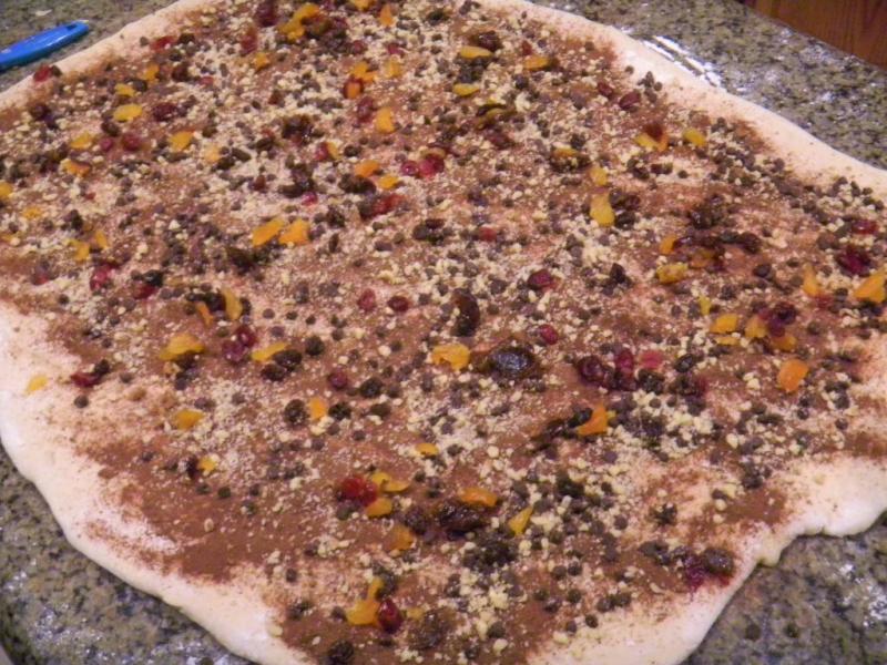 We did 2 sets of S&F’s, on 30 minute intervals, to develop the dough further. After another 15 minute rest we rolled out the dough a little less than ½” thick and into a huge rectangle 24” x 36”. Half the butter in the formula is in the dough and the other half is softened and schmeared onto the rolled out dough before the rest of the fillings go in. After sprinkling on the fillings in an even layer, then roll it up, from each wide side, meeting in the middle.