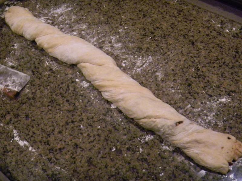 The starting in the middle, twist the roll toward each end to get the Twisted Sister part of the design. The roll will get longer but no worries, you need the length to get around the Bundt pan twice. Spray the pan liberally so nothing will stick, place half the streusel in the bottom of the pan and then coil in the Twisted Sister going around twice and ending where you began to ensure that the babka stays level as it rises.