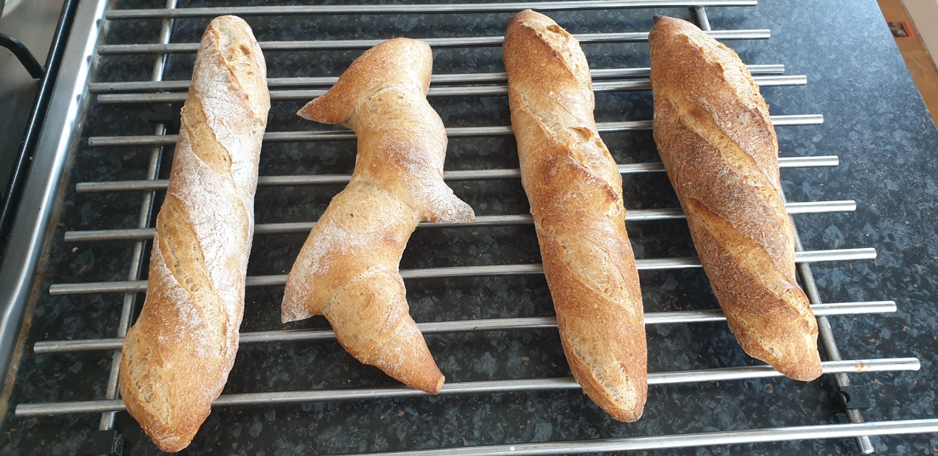 I also forgot to mention that another tweak I made between the first and second attempt was to bake the demi-baguettes lengthwise in the oven. The reason for this is in the past, when I transfer the baguettes off the peel into the oven sideways, I always seem to get a curve in the baguette. By putting them lengthwise into the oven, you are withdrawing the peel along the length of the baguette and this actually helps to keep it straighter, if anything. It does mean I have to cut the length down to 30 cm, but that is absolutely fine for my needs and works well for 4 x 240 g demi-baguettes with your recipe.