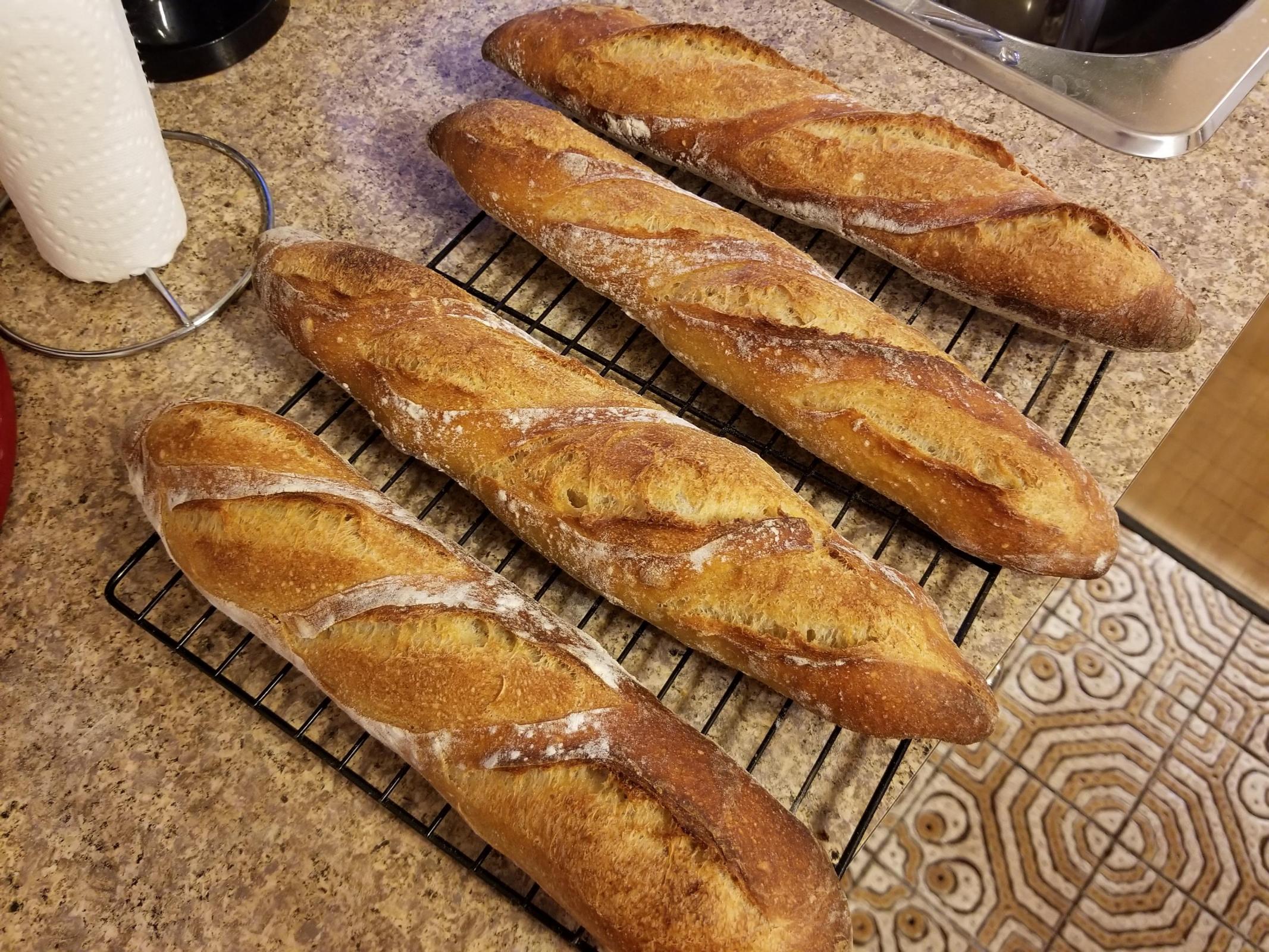 David, I wanted to share with you my first time baking your San Joaquin baguettes.  I generally followed your formula except that I ended bulk fermentation when the dough in my aliquot jar was at 20% rise.  The dough went into cold retard for 24 hours and I baked today. Divid and pre-shape, bench rest in loose cylinders for 20 minutes then shape.  The dough was much more extensible than I was expecting.  I then did a room temperature bench rest en couche for 30 mins and then back in the fridge to chill and firm to make scoring easier.