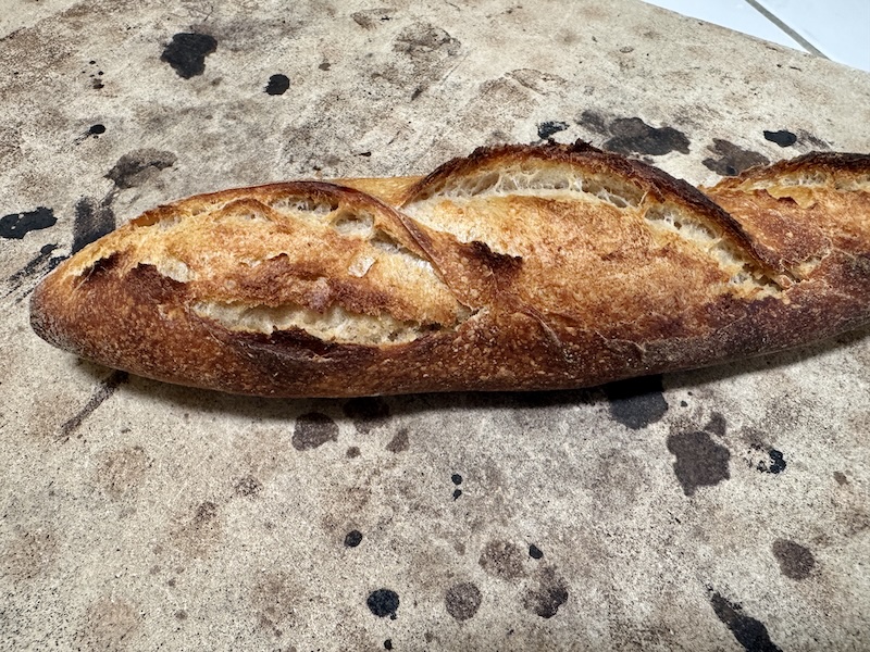 This was a bit of a disaster, ok maybe that is a bit dramatic, but because of a really boneheaded mistake of mine, it didn’t turn out as well as it might have. What would be a critical thing to miss doing related to the start of baking your baguettes? Steaming, no I remembered that and it was all set up, boiling water poured into the cast iron skillet. Let’s see I loaded the baguettes and they’re in there on the hot baking steel steam doing its thing. Maybe 1.5 minutes into steaming, OMG I didn’t score the baguettes!!! Have you ever wondered what baguettes would look like it you forgot to score them, then took them out, scored them as they were just starting to rise? Now the dough is warm instead of cold after having had them in the fridge for 60 minutes to firm up to score. Opening the oven of course lets the built up steam out.