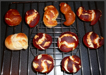 My results with lye have been satisfactory in color, but seems to still be lacking a flavor as strong as the ones I've had in Germany and Local bakeries in L.A. The color is a dark brown with hints or a burnt red, mixed in with golden brown color in the creases.