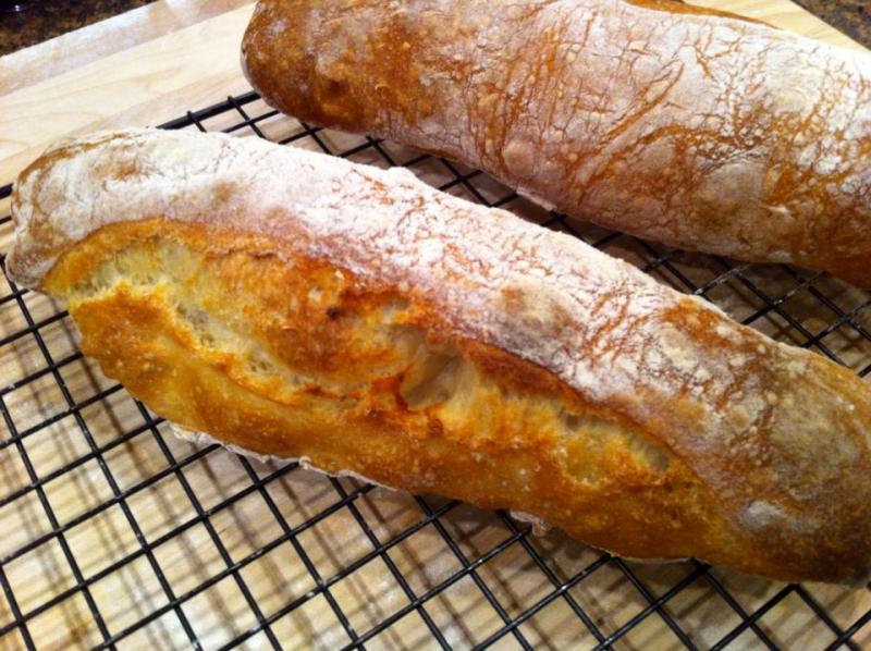 Because this was such high hydration, I let half of the batch rise longer and made ciabattas, just for comparison. The family enjoyed both of them, and the bread did not last very long! The "baguette" seemed to have a creamer crumb, whereas the ciabatta was a bit more dry. Overall, the ciabatta tasted better on the first day, but the baguettes better on the second day.