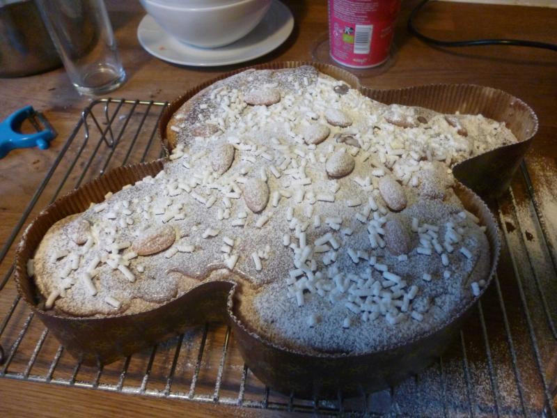 It's a great shame, because I'd been looking at the recipe for ages, thinking it would be great. Where is the hazelnut flavour?!?!? Another thing I've noticed is the how much growth in the colomba is lost to sideways motion. The circular shape of the panettone form is very strong, so all the growth is directed upwards. The colomba seems structurally weaker, you can see how the sides have bulged out and become distored.