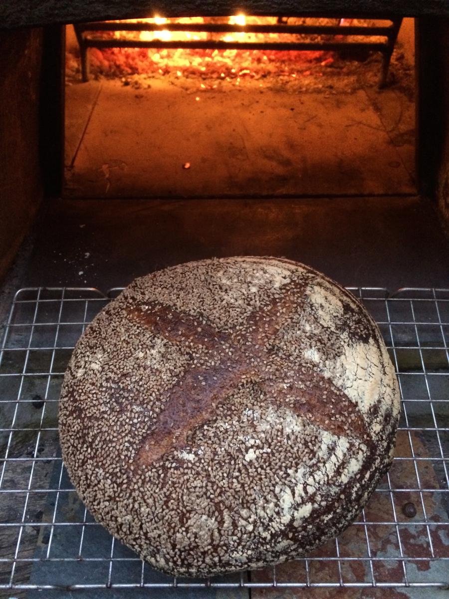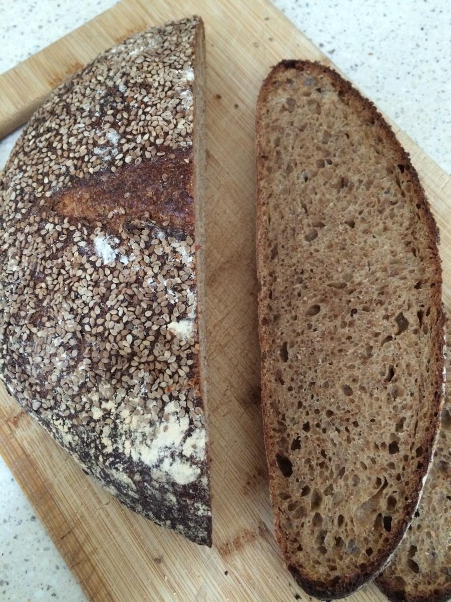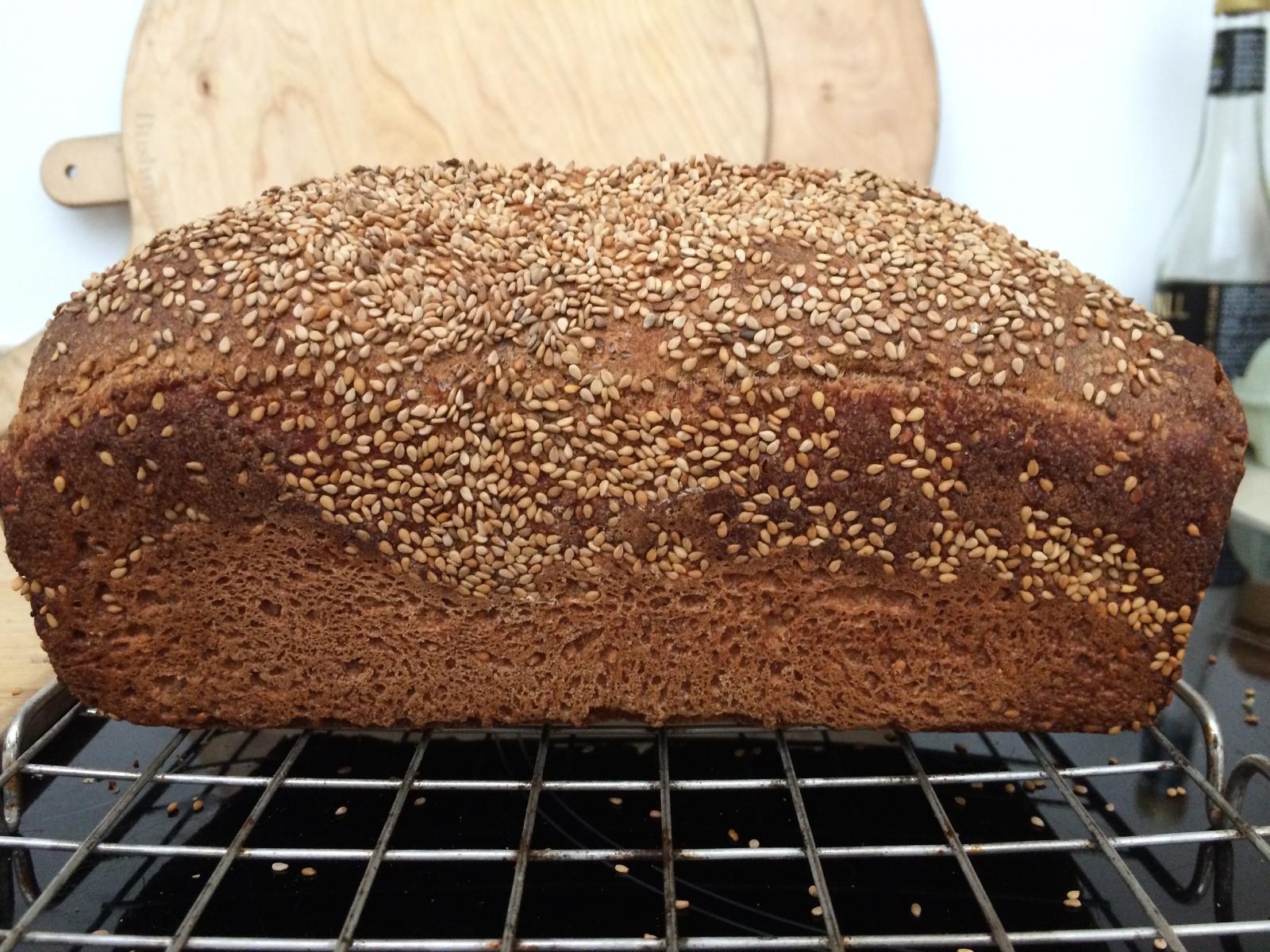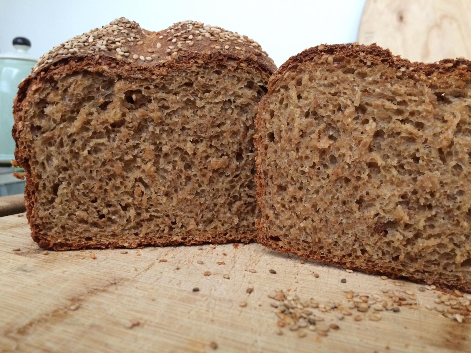 'First start off fresh yeast with a bit of malt syrup. Second, add water, veg oil, salt, wholemeal flour and sesame seeds, mix for a bit and leave to rise for thirty minutes. After this, divide up into loaf sized bits of dough, knead well and put into greased tins. Rise for at least half an hour and bake in a hot oven.'
