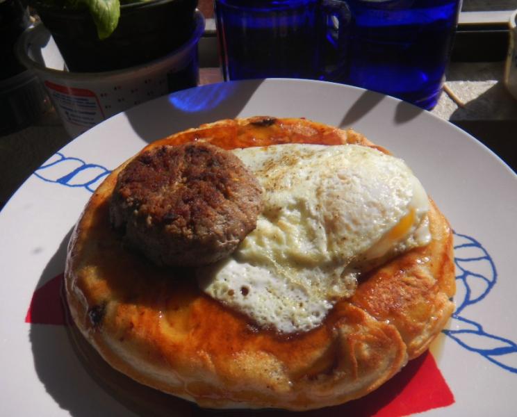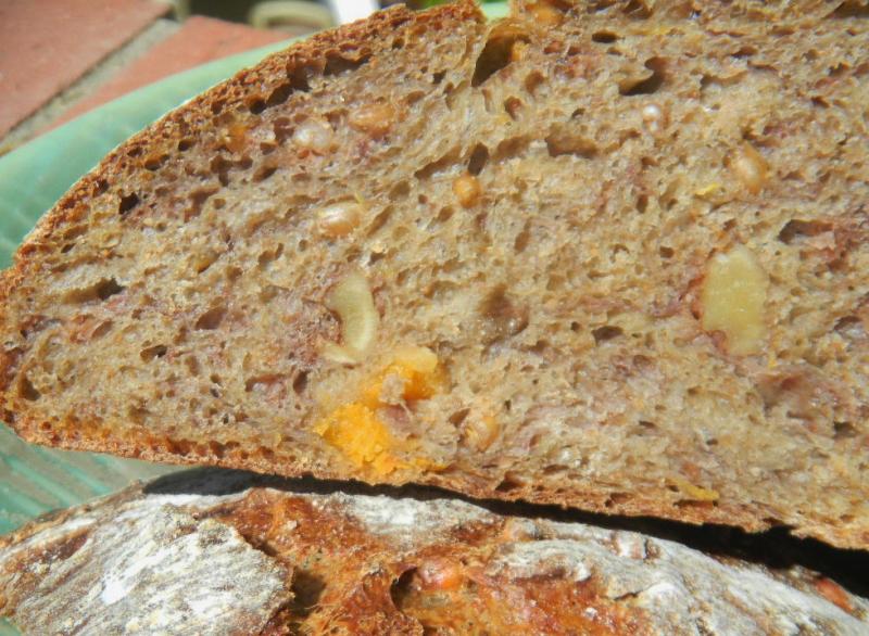 give the crumb a very interesting bright yellow splotch with a subdued purple tinged background . It is quite pleasing taste wise too with the apricot and fig juices contributing a light sweetness to counteract the bitterness of the walnuts. We loved it as a French toast this morning. This bread has a unique taste that we find especially pleasing to munch on toasted or not with a little butter.