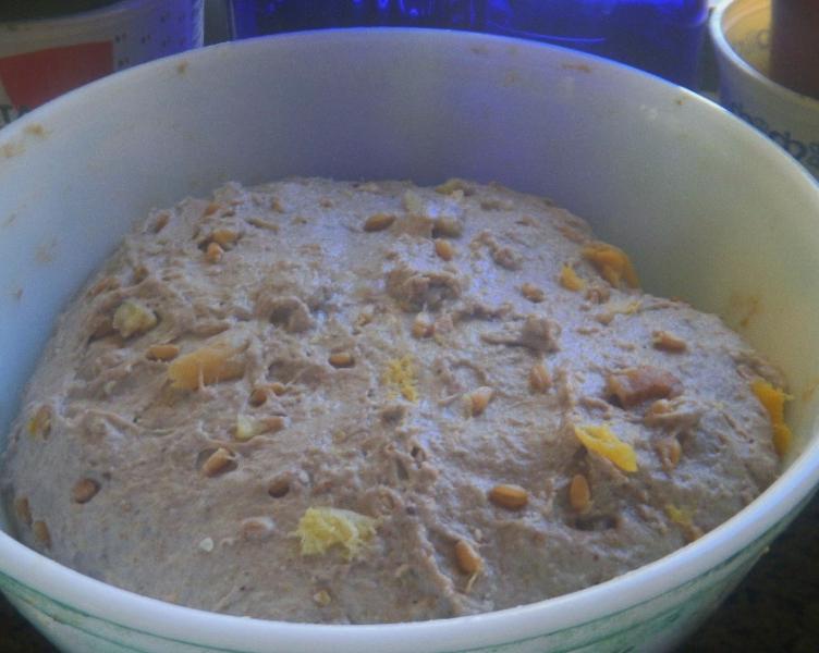When the starter came put of the fridge the net morning we also started the 4 hour autolyse of the fig juice, water, salt, flours, malts, VWG and Toadies. We micro waved the chopped apricots in water to get them re-hydrated and then prepared the walnut paste in the mortar and chopped the add in walnuts to get them to a more manageable size.