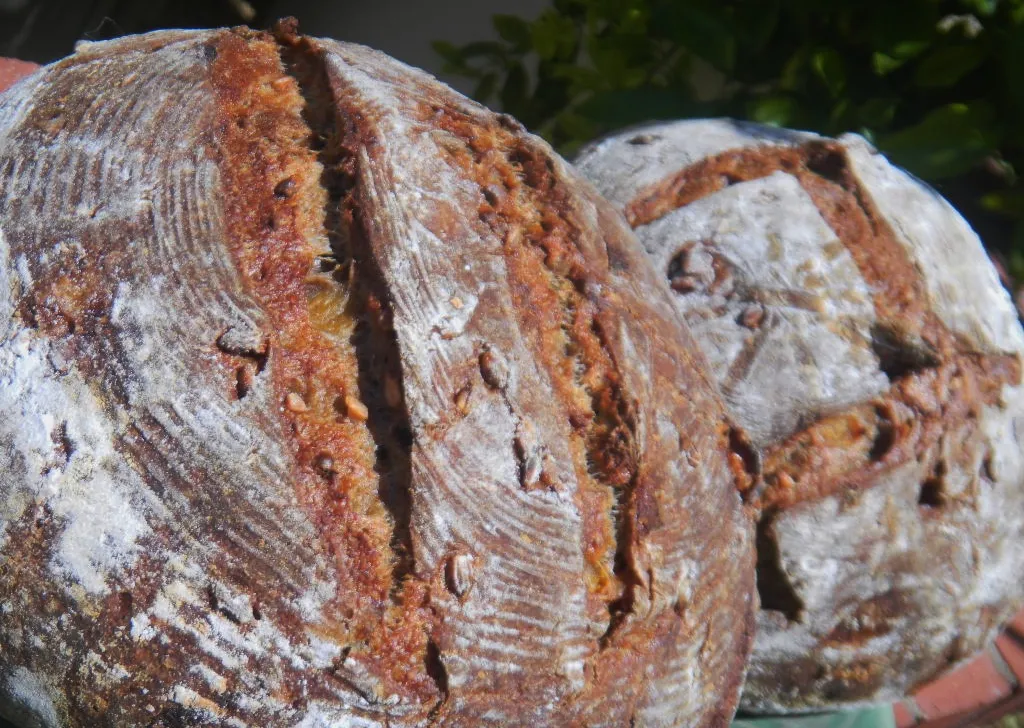 sweetbird’s bread has a light purple cast to the crumb because of the buckwheat and knowing we couldn’t use hazelnuts two times in a row, we immediately thought of Phil’s purple and green Walnut and Sage Super Hero Bread we like so much. We love the purple color the walnut paste gives to the crumb so 25 g of walnuts a 12 g of walnut oil were crushed together in a mortar and then we decided to use 75 g of quartered walnuts in the dough too.