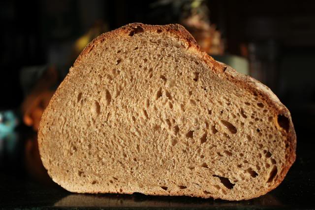 But these are small matters, the difference between a good bread and a really good bread.  The crumb is moist, but not soggy; firm, but with a pleasing softness; and eminently suited for its primary role as sandwich material.  No spilled mustard from those holes!  The flavor is primarily wheat, with distant notes of hazelnut and caramel.  There's only the smallest hint of a sourdough tang; quite suprising, considering the extended fermentation of both levain and dough.  The fragrance tells you immediately that this is the real deal, not a tricked up wannabe.