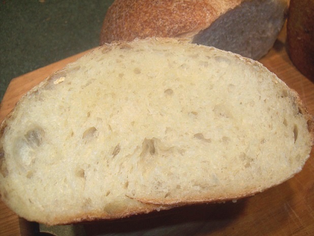 And the semolina. The lighting here is horrible, because it was starting to get darker out and I can't figure out how to get very decent pictures with indoor lighting. Anyway, it was relatively open. Haven't tasted it yet. I cut one of all the loaves in the center to look at the crumb because previously I have had really open crumb on the edges and tighter in the center.